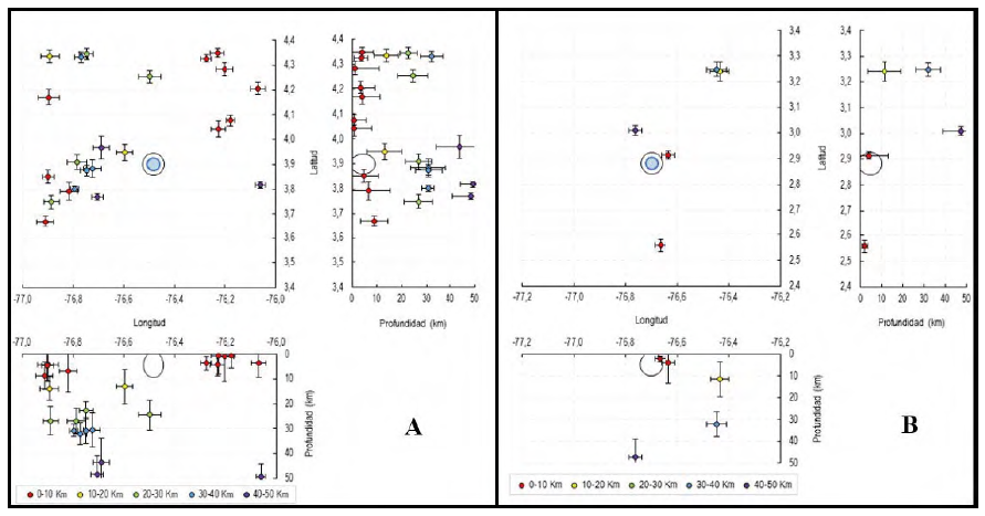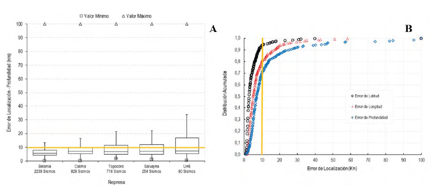 El criterio de filtrado utilizado para seleccionar los eventos sísmicos con la mejor localización determinó que, el parámetro “error de profundidad” direccionó esta selección por encima de los errores de latitud y longitud; reflejando una menor reducción de registros para las represas de Betania y Calima, en comparación con la represa de Urrá (por su baja cantidad de datos no fue incluida en el presente artículo), tal como se observa en la Figura 14.