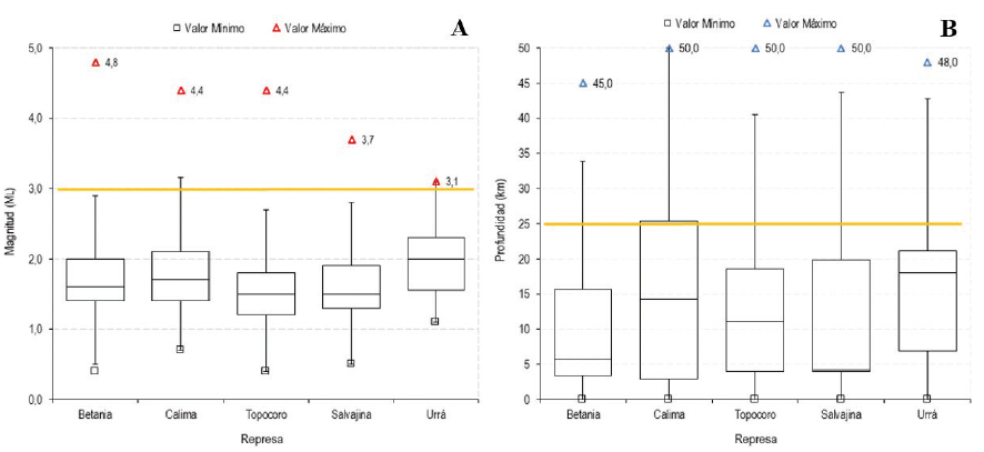 Los eventos sísmicos registrados en el área circundante a las represas de estudio fueron obtenidos con base en la información disponible consultada de forma pública a través de la página web de la Red Sismológica Nacional de Colombia (RSNC). Para esta búsqueda se definió un límite de 50 km a partir del centro de la represa (mediante consulta cuadrada) y un máximo de profundidad de 50 km. De esta consulta se obtuvo información sobre fecha y hora de los eventos, coordenadas de ubicación (latitud, longitud y profundidad), magnitud (ML), así como los errores relacionados con el proceso de localización de los sismos, entre otros; dentro de una ventana temporal comprendida entre los años 2000 y 2017.