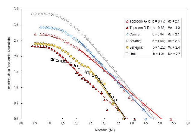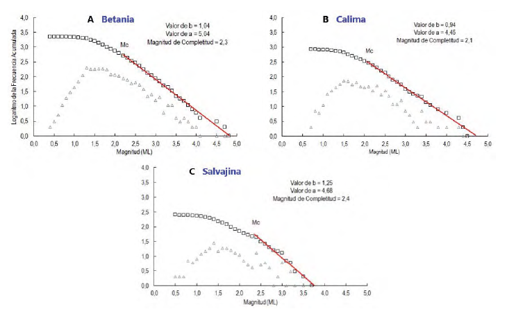 Frente a la relación Gutenberg-Richter (G-R), los resultados del parámetro “b” arrojaron resultados muy cercanos para las inmediaciones de las represas Betania y Calima, existiendo una leve tendencia a la ocurrencia de eventos de mayor magnitud frente a eventos de menor liberación de energía en el entorno de Calima (Figura 7). Para la represa de Salvajina, el parámetro “b” obtenido fue mayor respecto a las dos represas anteriores, ofreciendo una tendencia a la ocurrencia de eventos sísmicos de menor magnitud.
