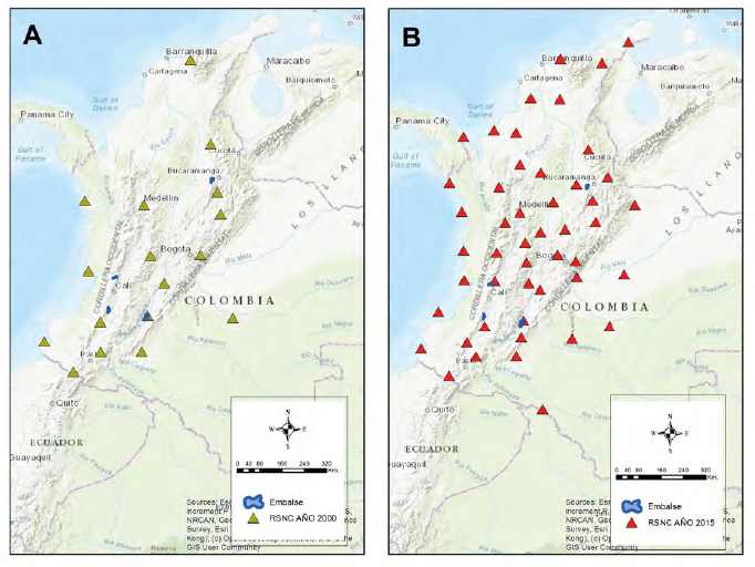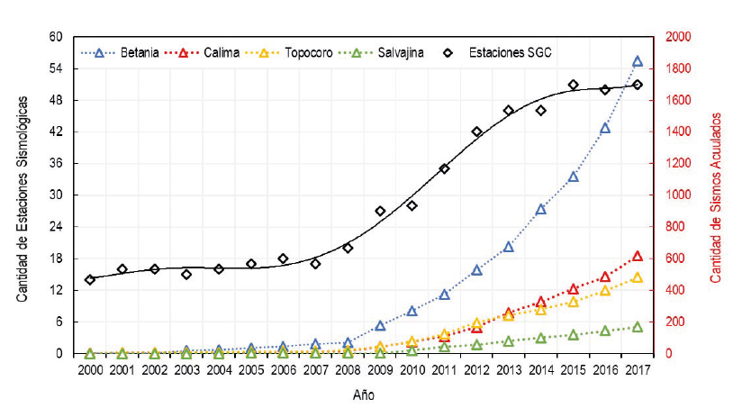 En relación con los eventos sísmicos ocurridos en los alrededores de las represas entre los años 2000 y 2017, es importante analizar que para cada una de ellas se observó un incremento en la cantidad de sismos registrados a partir de los años 2008 y 2009, el cual, aunque no ofrece la misma tasa de crecimiento para todas las represas si guarda una coherencia con el incremento en la cantidad de instrumentos sísmicos que fueron puestos en operación por la RSNC a partir del año 2008, lo que mejoró la detección y localización de los sismos en estas regiones, tal como se observa en la Figura 17.