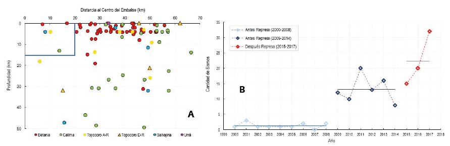 Al analizar los sismos ML ≥ 3,0 registrados cerca a cada represa, pocos eventos se localizan dentro de los primeros 20 km de distancia y en profundidades menores a los 15 km; límites que suelen relacionarse con eventos antropogénicos disparados (o inducidos) por embalses (Figura 19). No obstante, análisis realizados para la represa de Topocoro, teniendo en cuenta los eventos registrados en los primeros 5 km de profundidad (después del proceso de filtrado), evidencian un aumento en la cantidad de eventos ocurridos después de entrar en operación el embalse, sin que existiera una variación significativa en la cantidad de estaciones sismológicas en operación durante el período 2015 a 2017 (Figura 17).