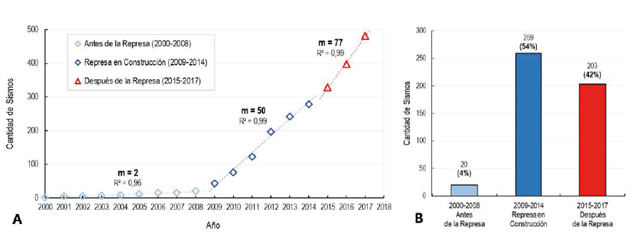 Casos de sismicidad disparada por represas también han sido estudiados en Latinoamérica, destacando el estudio de la secuencia sísmica de El Cuchillo (más de 120 sismos 2,8 ≤ MD ≤ 4,5, localizados entre 1 y 20 km de profundidad), ocurrida entre octubre de 2013 y julio de 2014, en la cuenca de Burgos al noreste de México (Montalvo-Arrieta et al., 2018). El estudio señala que el factor detonante de esta sismicidad puede estar relacionado con el cambio del volumen de agua del embalse El Cuchillo, como consecuencia de 3 años de sequía que vaciaron la represa y su rápido proceso de llenado después de la ocurrencia del Huracán Ingrid (2013), lo que propició un incremento de su capacidad cercano al 40% de su volumen en unos pocos días.