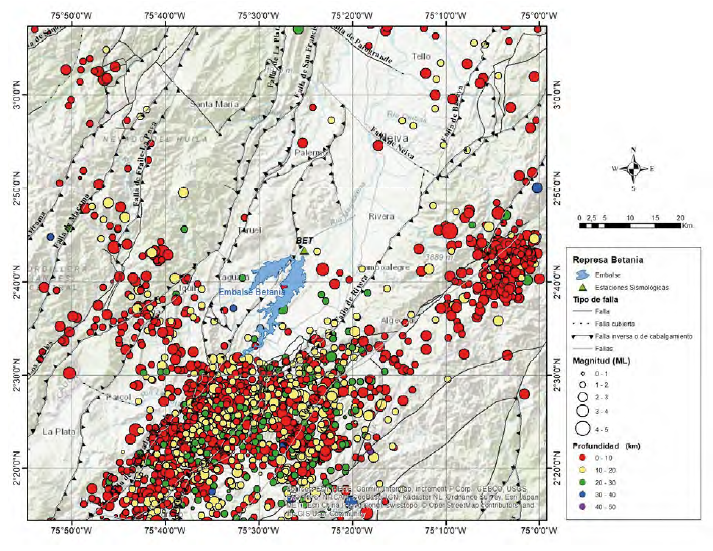 En relación con la represa de Betania, la mayor cantidad de eventos registrados en sus alrededores ocurrieron al sur del embalse (Figura 3), con una gran concentración de sismos en los primeros 5 km de profundidad (48,9% del total de los 1848 eventos filtrados). Se observa que los sismos guardan relación con la orientación de los principales sistemas de fallas identificados en la región (fallas de El Agrado-Betania, de Algeciras y de Rivera).