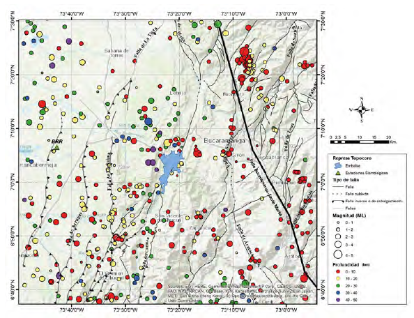 Para la represa de Topocoro los eventos se encuentran más dispersos y retirados del centro del embalse (Figura 4), aunque se mantiene la tendencia de registro de una mayor cantidad de sismos en los primeros 5 km de profundidad (32,7% del total de 482 eventos filtrados). En relación con la orientación de los sismos con los sistemas de fallas existentes en cercanía al embalse, algunos se concentran en dirección NE-SW, coincidiendo con las fallas de Arrugas y La Salina, y otros en dirección NW-SE, coincidiendo con la orientación de la falla Bucaramanga-Santa Marta.