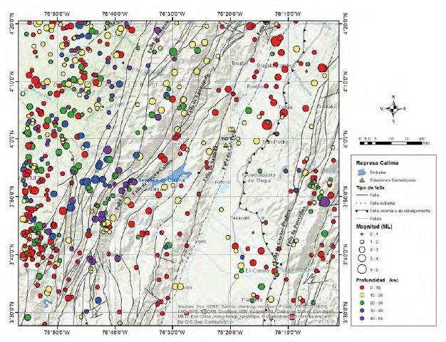 En relación con la represa de Calima, 617 eventos se registraron después del filtrado (Figura 6), de los cuáles el 36% se concentró en los primeros 5 km de profundidad. Frente a su distribución espacial, se observa una ligera concentración de sismos hacia el occidente del embalse que guardan relación con los sistemas de fallas Dagua- Calima y de Trujillo. A profundidades mayores a 50 km (fuera del límite de consulta del estudio), los eventos sísmicos estarían influenciados por deformación de la corteza en la denominada zona de Wadatti-Benioff intermedia (Pérez et al., 2014).