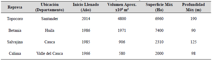 Colombia cuenta actualmente con más de treinta (30) represas distribuidas en diversos puntos de su geografía (Palacios, 2013). Los principales propósitos para su construcción obedecieron a la generación de energía eléctrica, el abastecimiento de agua potable y el riego. Después de evaluar sus características técnicas, se seleccionaron cuatro embalses cómo áreas objeto de estudio (Tabla 1 y Figura 1), destacando como criterio de priorización su capacidad de almacenamiento de agua, condición relacionada en la literatura técnica como uno de los principales factores que se asocian con la generación de sismicidad antropogénica (Consorcio Generación Ituango, 2011; Barros et al., 2018).