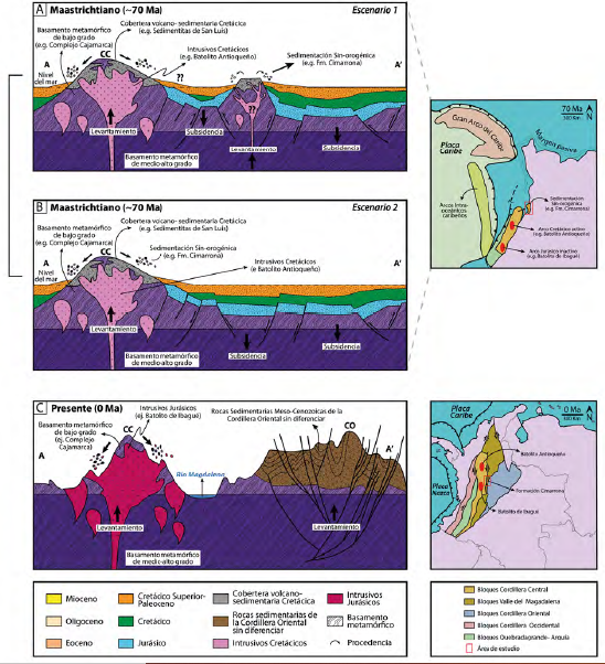 En los Andes colombianos, es posible reconocer en las tres cordilleras y los valles intramontanos que las separan (Magdalena y Cauca) diferentes remanentes de esta compleja historia geológica. La Cordillera Oriental y el Valle del Magdalena exponen un registro del Cretácico, caracterizado por unidades sedimentarias acumuladas en fondos marinos someros que favorecieron la acumulación de extensos depósitos de shales negros, calizas y chert (Etayo et al., 1976; Villamil, 1999; Elrich et al., 2003), los cuales se acumularon sobre una secuencia clástica y carbonatada relacionada con una historia extensional previa que modificó el borde continental durante el Jurásico Superior y el Cretácico Inferior (Sarmiento-Rojas et al., 2006; Mora et al., 2009). Estas condiciones de acumulación, dominadas por una subsidencia termal, relacionadas con una fase de tectónica más tranquila, cambiaron en el Cretácico Superior-Paleoceno, cuando los ambientes de acumulación registraron condiciones regresivas, marcadas por acumulaciones en ambientes de plataforma marina (e.g. Formación Umir), ambientes marginales de tipo abanico deltaico (e.g. Formación Cimarrona) y ambientes continentales caracterizados por sistemas de canales sinuosos someros (e.g. Formación Seca), los cuales documentan el inicio de la emergencia de los Andes en Colombia desde el Campaniano Temprano (Gómez et al., 2003; Bayona, 2018).