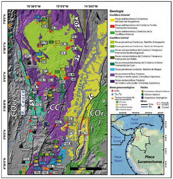 La Cordillera Central y el segmento occidental del Valle del Magdalena se caracterizan por la presencia de basamento plutónico y metamórfico de edad Pérmica y Triásica, con edades entre 236 Ma y 277 Ma (Villagómez et al., 2011; Cochrane et al., 2014a; Spikings et al., 2015; Bustamante et al., 2017; Rodríguez-García et al., 2019; Figura 1), así como algunos remanentes escasamente expuestos de rocas ígneas Carboníferas (Leal-Mejía et al., 2019). Una extensa serie de rocas volcánicas y plutónicas Jurásicas, con edades entre 190 Ma y 142 Ma, se encuentra ampliamente expuesta en el flanco oriental de la Cordillera Central y también en los valles Medio y Superior del Magdalena. Además rocas metamórficas de bajo a medio grado con circones detríticos con edades jurásicas, de entre 163 y 193 Ma, formadas a partir de rocas volcano-sedimentarias, ocurren en el flanco oriental de la Cordillera Central (Bustamante et al., 2010, 2016, 2017; Leal-Mejía, 2011; Villagómez et al., 2011; Blanco-Quintero et al., 2014; Cochrane et al., 2014b; Naranjo et al., 2018). El registro sedimentario Cretácico incluye una serie de secuencias clásticas transicionales y marinas del Cretácico Inferior (e.g. Sedimentitas de San Luis, Berlín, Amalfi, Formaciones Abejorral y Valle Alto), las cuales en conjunto con algunos remanentes de rocas volcánicas tales como el Complejo Quebradagrande y la Formación San Pablo se encuentran expuestas de forma discontinua en la zona axial y en ambos flancos de la Cordillera (Figura 1), y estarían caracterizadas por un metamorfismo de muy bajo grado, frecuentemente relacionado con zonas de falla asociadas a una deformación del Cretácico Superior (Nivia et al., 2006; Villagómez et al., 2011; Rodríguez y Cetina, 2016; Jaramillo et al., 2017; Rodríguez-García y Celada-Arango, 2018; Avellaneda- Jiménez et al., 2020; Cardona et al., 2020; Zapata et al., 2019). Una serie de cuerpos ígneos plutónicos de composición granodiorítica a tonalítica con afinidad de arco magmático y edades entre 98 Ma y 58 Ma, dentro de los que se destaca el Batolito Antioqueño, intruyen el basamento más antiguo y las unidades Cretácicas (Ordóñez-Carmona y Pimentel, 2001; Ibáñez-Mejía et al., 2007; Villagómez et al., 2011; Duque-Trujillo et al., 2019; Leal-Mejía et al., 2019; Cardona et al., 2020; Figura 1).