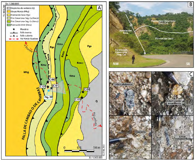 La Formación Cimarrona redefinida por Gómez y Pedraza (1994) aflora en la vía Honda-Guaduas (Departamento de Cundinamarca), en el flanco occidental del Sinclinal de Guaduas, en el piedemonte occidental de la Cordillera Oriental. Esta unidad está expuesta en una serie de escamas tectónicas repetidas (Figura 2) que culminan en la parte inferior en contacto fallado inverso con rocas del Mioceno del Grupo Honda, marcando la historia deformacional post- Miocena del flanco oriental de la Cordillera Oriental (Gómez et al., 2003; Cortés et al., 2006).