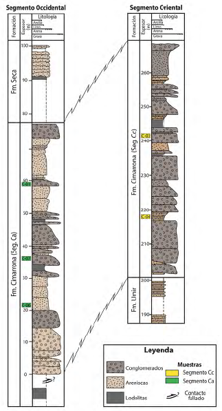 Gómez y Pedraza (1994) relacionan esta formación con los paquetes conglomeráticos descritos por De Porta (1966), dividiéndola en segmento Ca y segmento Cc, correspondientes a los miembros Primavera y La Fría, los cuales representarían variaciones laterales del sistema depositacional. Las relaciones de campo (Figura 2B), muestran que el segmento Cc y la subyacente Formación Umir están en contacto fallado con la Formación Seca, la cual reposa concordantemente sobre el segmento Ca, lo cual coincide con la variación lateral del sistema depositacional que representan el segmento Ca y Cc sugerida en trabajos anteriores (Gómez y Pedraza, 1994).