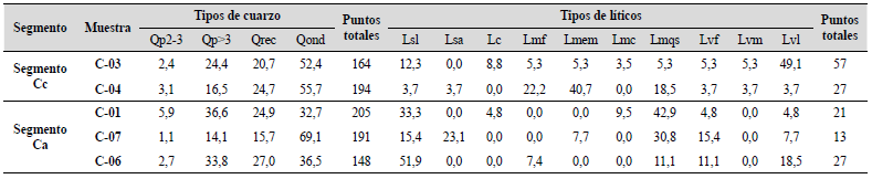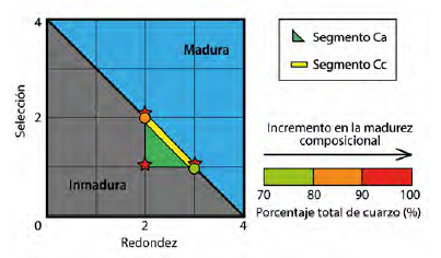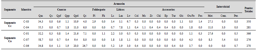 Las tres muestras del segmento Ca incluyen areniscas conglomeráticas tanto en la parte inferior como superior con clastos entre 2 mm y 3 cm de diámetro. Las partículas del armazón presentan dos modas en la redondez, una angular y otra redondeada, con una predominancia de los granos redondeados, así como una baja esfericidad. En general las rocas son inmaduras texturalmente (Figura 4), con una alta madurez composicional, como lo sugiere los contenidos de cuarzo mayores al 90% (Figura 4).