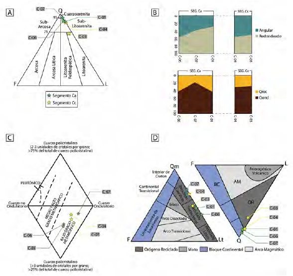Al igual que las rocas del segmento Ca, las muestras se caracterizan por presentar un mayor porcentaje de cuarzo monocristalino ondulatorio y cuarzo policristalino de más de tres cristales. De este modo, la fuente principal correspondería a rocas de bajo grado metamórfico (Figura 5C). En los diagramas de discriminación tectónica (Dickinson, 1985; Garzanti, 2016), las muestras de este segmento caen en el campo de orógeno reciclado (Figura 5D).