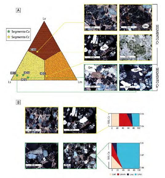Los fragmentos de roca presentes en las areniscas del segmento Ca corresponden principalmente a líticos sedimentarios (72,3%-86,9%) presentando una menor cantidad porcentual de líticos metamórficos (5,0%- 23,4%) y líticos volcánicos (4,2%-8,6%) (Figura 6A). Los líticos sedimentarios están representados fundamentalmente por fragmentos de chert y lodolitas, los cuales son más abundantes en la parte inferior del segmento. Los líticos volcánicos corresponden a líticos de textura lathwork y felsítica, los cuales están presentes de forma casi constante a lo largo del segmento. Finalmente los fragmentos de roca metamórficos provienen de rocas con metamorfismo de muy bajo a bajo grado, y están representados en mayor medida por líticos metamórficos cuarzo-sericíticos y líticos filíticos, con menor aporte de líticos de metacalizas y líticos de esquistos moscovíticos (Figura 6B).