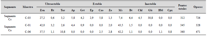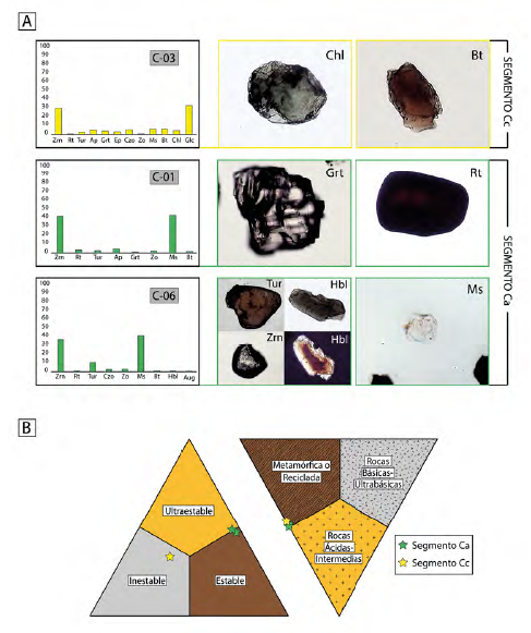 Las areniscas presentan minerales pesados inestables, estables y ultraestables. Los ultraestables están representados fundamentalmente por circón con porcentajes que oscilan entre 37,5% y 42,0%, la turmalina y el rutilo son las otras fases minerales ultraestables con porcentajes entre 2,6% y 10,8% y entre 1,1% y 3,2% respectivamente (Figura 7A). Los minerales estables presentan una distribución semejante a los ultraestables (Figura 7B), con la moscovita (42,2%-43,5%) como mineral dominante, acompañada de clinozoicita y zoicita en la muestra inferior, y apatito, granate y zoicita en la muestra más superior. Finalmente, los minerales inestables no superan el 4% (Figura 7B), y están representados por biotita, hornblenda y augita en la parte inferior, y biotita en la parte superior.