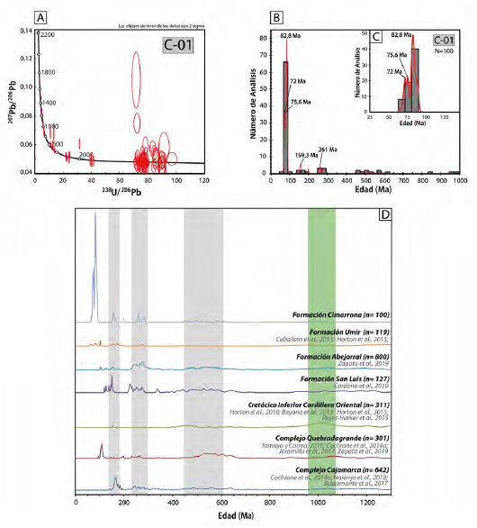 La evaluación de las poblaciones de circones detríticos para estas unidades indica para los metasedimentos Jurásicos y Pre-Triásicos del Complejo Cajamarca picos de distribución del Jurásico (165 Ma), Pérmico-Triásico (249-286 Ma) y el Neoproterozoico (553- 640 Ma) con algunos menos representativos de edad Mesoproterozoica (1000-1218 Ma). El Complejo Quebradagrande presenta picos representativos del Cretácico Inferior (107 Ma), Pérmico-Triásico (237- 260 Ma) y Cámbricos-Neoproterozoicos (495-630 Ma) con algunas edades menos características Jurásicas (147-191 Ma) y Proterozoicas (1056 Ma). Las rocas que representan el Cretácico Inferior de la Cordillera Oriental (Chipaque, Une, Guadalupe, Macanal, Buenavista y Las Juntas) incluyen un pico de edad característico Mesoproterozoico (1023 Ma) con algunas edades menos importantes Cretácicas (154 Ma) y Pérmicas (267 Ma). La Formación San Luis del Cretácico Inferior presenta picos principales de edad Jurásica (149 Ma), Pérmico- Triásica (222-276 Ma) y Carbonífera (341 Ma), con picos menores Cretácicos (119-136 Ma), Cámbricos- Neoproterozoicos (423-636 Ma) y Mesoproterozoicos (1030 Ma). La Formación Abejorral presenta un pico representativo Pérmico-Triásico (244-270 Ma) con picos menos representativos de edad Cretácica Inferior- Jurásica (101-149 Ma), Cámbrica-Neoproterozoica (462-610 Ma) y Mesoproterozoica (1035 Ma).