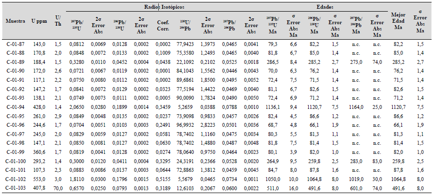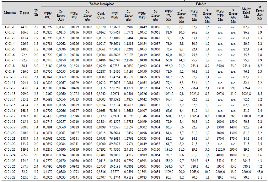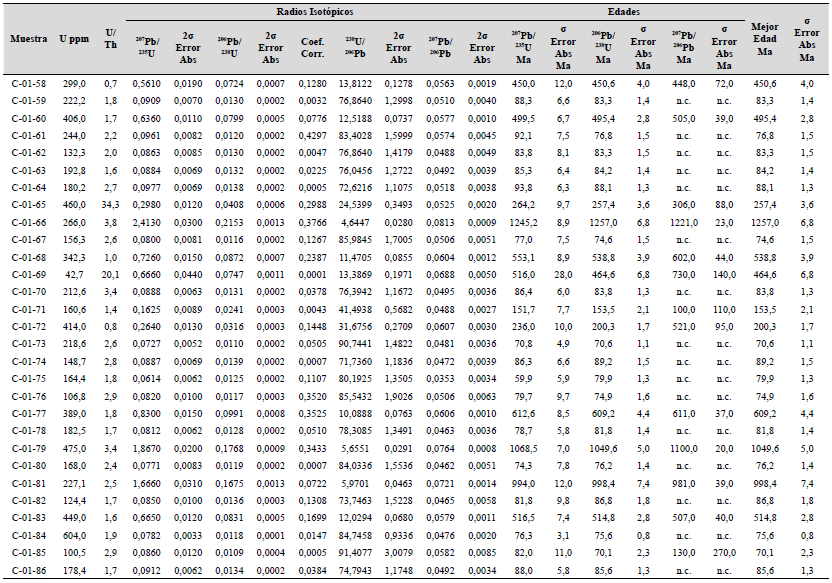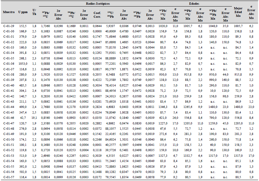 Fueron analizados 100 circones de la muestra (C- 01) perteneciente al segmento Ca (Figura 8A). En la Tabla 4 se encuentran los resultados obtenidos en la geocronología U-Pb realizada en circones detríticos de la muestra C-01.