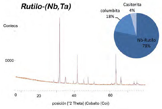 Difracción de rayos X (DRX). Cristales pulverizados de rutilos-(Nb,Ta) fueron analizados en los laboratorios Alpha 1 en un difractómetro de rayos X marca PANalytical modelo Empyriam, en configuración Bragg-Brentano con un detector de estado sólido de alta velocidad PIXCEL 3D 2x2 para la adquisición de datos, la cuantificación se realizó por el método RIR (Reference Internal Ratio) cuando era aplicable.