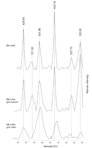 Espectroscopia RAMAN. Los espectros Raman inducidos por láser permiten distinguir variaciones químicas y mineralógicas como los tres polimorfos de TiO. (rutilo, anatasa y brookita) de manera no destructiva (Hanaor y Sorrell, 2011) a microescala en muestra y sección delgada (Meinhold, 2010). Acoplado a un microscopio óptico de alta resolución se logra mapear variaciones químicas y texturales en el rango de sub-micrómetros en materiales inorgánicos y orgánicos (Nasdala et al., 2012). En este estudio se analizaron 2 secciones pulidas de rutilos-(Nb,Ta) y para comparar, 1 de casiterita y 1 de columbita-tantalita de Venezuela, en el equipo micro-Raman dispersivo del CDTEC usando un espectrómetro Nicolet Almega acoplado con un microscopio Olympus con láser de 532 nm apertura, de 25 micras (pinole) en una gratícula de 2400 líneas/mm. Los datos fueron colectados durante un tiempo de exposición de 60 s y un número de exposiciones de 5.
