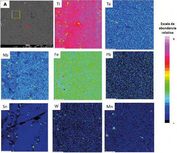 EPMA. Las imágenes composicionales de la microsonda de un rutilo-(Nb,Ta) (Figura 11) y su análisis cuantitativo (Quant1) confirmaron el Ti como componente principal, y Fe, Nb y Ta como elementos menores que forman parte de la estructura cristalina, pero además se encuentran enriquecidos en las inclusiones; en menor proporción elementos como Pb y W. El Mn y Sn están prácticamente restringidos a las inclusiones.