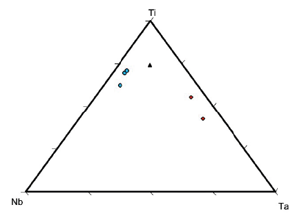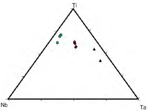 Los datos obtenidos de los análisis FRX fueron normalizados y graficados en un diagrama ternario (Ti, Ta y Nb) (Figura 8) y comparados con datos bibliográficos de microsonda realizados a cristales de rutilos (Nb) provenientes de pegmatitas en Canadá y Venezuela, con menores o mayores concentraciones de Ta y Nb.