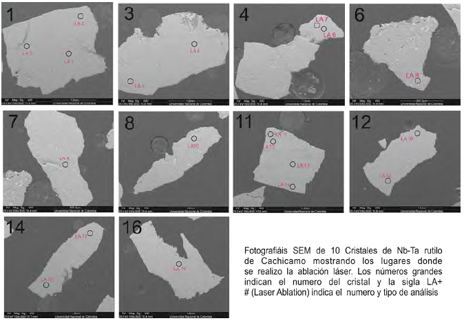 Datación radiométrica U/Pb mediante LA-ICP- MS. En un equipo de ICP-MS Element 2 (Thermo Scientific) acoplado a un sistema de ablación laser Excite (Photon Machines), en el Servicio Geológico Colombiano se confirmó que un cristal de rutilo- (Nb,Ta) tenía suficiente U, Th y Pb para intentar realizar datación en el LA-ICP-MS de la plataforma analítica GeOHeLiS (Universidad de Rennes en Francia). Con 20 cristales de rutilo-(Nb,Ta) se preparó una sección pulida y se adquirieron fotografías MEB para la selección de los puntos de ablación. El LA- ICP-MS Agilent 7700x es equipado con un sistema de bombeo dual para aumentar la sensibilidad. El sistema Excimer 193 nm ESI (NWR193UC) produce un láser coherente con duración de impulsos ultra-corta (<5 ns) y una célula de ablación con dos volúmenes Truline que tiene una duración de “wash-out” de menos de 0,2 segundos, completamente controlado por ordenador. Para el óptimo posicionamiento del láser en la muestra se tomaron fotografías MEB de los cristales de rutilo- (Nb,Ta) escogiendo las zonas más homogéneas que no presentaron inclusiones o las presentaron en muy baja proporción. Debido al tamaño de los cristales y el poco contenido de U y Pb la ablación de los granos con láser fue realizada en spots de 65 micras, utilizando una frecuencia de 5 Hz y una intensidad de 8,44 J/cm.. El material evaporado fue cargado por un flujo de He (~0,40 L/min) y Ar (~0,90 L/min).