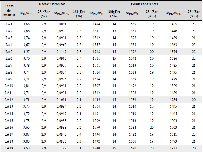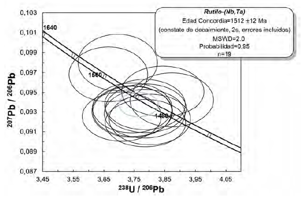 Datación radiométrica U-Pb en rutilos-(Nb,Ta) de Cachicamo. Los datos radiométricos U/Pb (Tabla 3) de un total de 19 puntos de ablación fueron medidos en 10 fragmentos de cristales de rutilo-(Nb,Ta) (Figura 13), las correcciones y el diagrama concordia muestran una edad concordante de cristalización de 1512±12 Ma con un parámetro MSWD=2.0 (Figura 14).