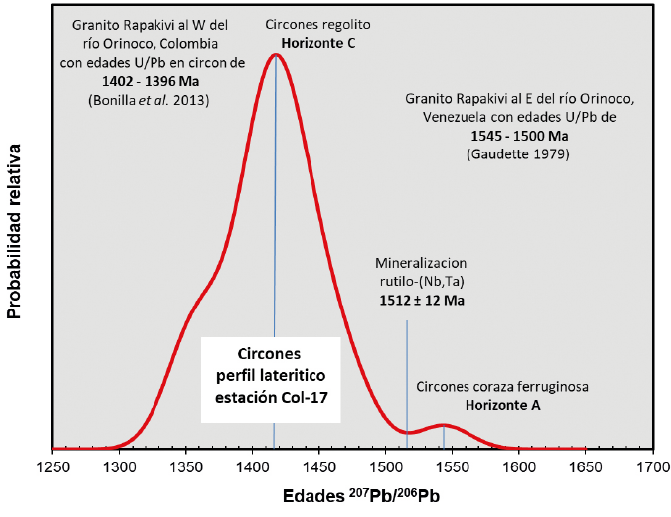 Datación radiométrica U-Pb en circones de los horizontes A y C. Las edades de cristalización obtenidas en los circones detríticos analizados fueron graficadas en la curva de probabilidad relativa (Figura 15) para las edades concordantes exhibiendo dos rangos de edades así: circones del Horizonte C (regolito caolinizado) con edades entre 1400 y 1420 Ma y circones del Horizonte A (coraza ferruginosa), que contiene también los cristales de rutilo-(Nb,Ta), arrojan edades entre 1500-1550 Ma.