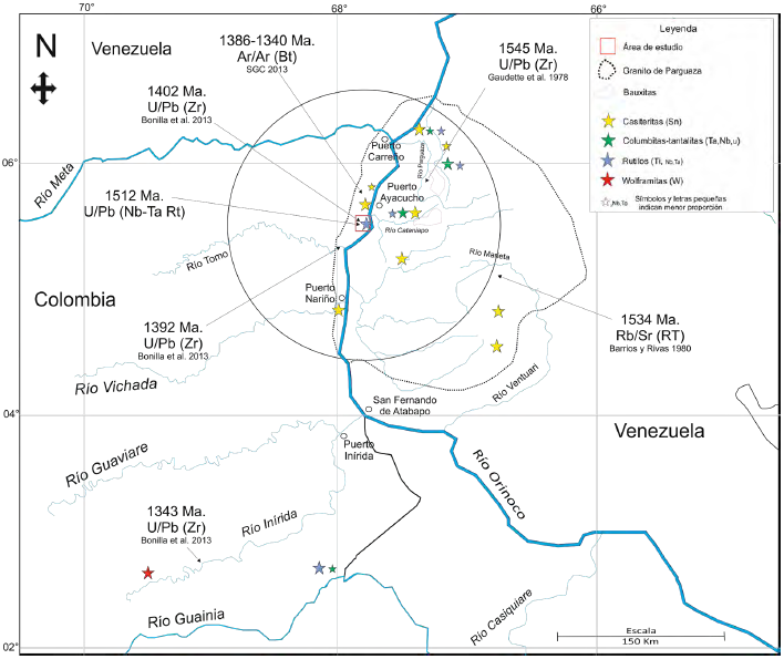En cercanías a Puerto Carreño, en la zona El Burro– Aguamena, Estado de Bolívar, Venezuela, Aparicio et al. (1977) postulan que la fuente generadora de las manifestaciones de estos minerales fueron rocas pegmatíticas. La empresa Desarrollo Minero del Amazonas C.A. DEMINA concluyó que estas mineralizaciones (El Burro) se formaron en pegmatitas de cuarzo con Ta, Nb, Sn, Zr, y Ti, como parte de las últimas etapas de cristalización de un magma ácido, lo cual proponen también Bolívar y Manrique (2011). En Colombia, estudios realizados en el Departamento del Vichada (ej. Galvis, 2001) confirmaron la presencia de una serie de diques pegmatíticos asociados en su mayoría al Granito de Parguaza (1400 Ma; Bonilla- Pérez et al., 2013) como los observados principalmente en los cerros Bita, La Hormiga, Bandera, Santa Helena, Casuarito, San Roque, Guarípa, Cachicamo, Humeante y Palomazón en el municipio de Puerto Carreño (Figura 1 y 2), pero carentes de mineralización.