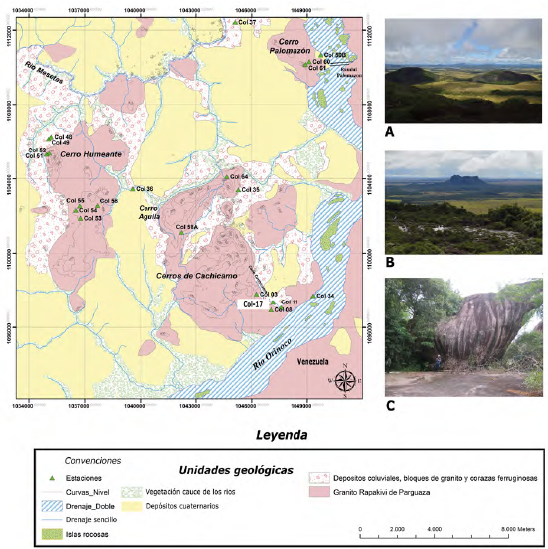 Basamento cristalino del Granito Rapakivi de Parguaza. Aflora conformando un sistema de cerros aislados de morfología redondeada y de pendientes fuertemente inclinadas, con alturas máximas de 400 msnm, de los cuales sobresalen los cerros de Cachicamo, Humeante, Águila, Casuarito, San Roque, Dagua, Zamuro, Murciélago y otros de menor altura como Palomazón, Conejo y Katano que forman parte del extenso Granito de Parguaza en esta zona (Figuras 1 y 2). Presentan textura rapakivi con fenocristales ovoides de feldespato potásico de hasta 10 cm de diámetro, con inclusiones de biotita formando textura poiquilítica. Su composición mineral aproximada es de cuarzo 25%, feldespato potásico 60%, plagioclasa 10%, biotita 15%, pero hay también variaciones de granitos con cristales finos. Los cuerpos rocosos están cortados por un sistema de diques pegmatíticos de distintos espesores, aplitas y venas de cuarzo en arreglos enrejados. Los diques parecen estar controlados estructuralmente, rellenando pequeñas diaclasas y fallas con orientación preponderante NE, las venas no presentan una orientación preferencial y parecen estar rellenando diaclasas. Las rocas ígneas leucocráticas de textura rapakivi se presentan como un cuerpo homogéneo sin texturas de flujo y en algunos casos con meteorización avanzada.