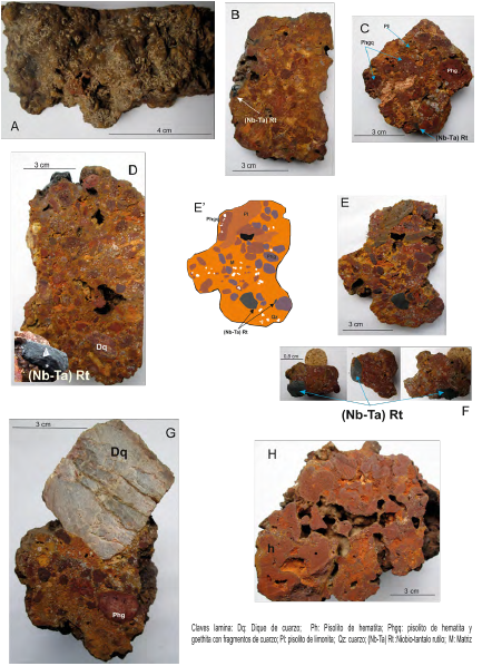 A. Apariencia externa de fragmento de corazas mostrando un predominio de la matriz de óxidos e hidróxidos de hierro. B. Corte transversal mostrando la asociación mineral principal compuesta por pisolitos, nótese un cristal de rutilo de 0,8 cm de diámetro. C. Fragmentos de pisolitos, cuarzo y cristal de rutilo- (Nb,Ta) de 0,4 cm de diámetro. D. E. y F. Cristales de rutilo-(Nb,Ta) de hasta 3 cm y pisolitos en una matriz de oxi-hidróxidos de Fe. G. Fragmento retrabajado de dique de cuarzo y feldespato de 5 cm de diámetro incluido en coraza. H. Coraza ferruginosa de la estación Col-17F a 300 m del depósito, nótese la textura arriñonada y la ausencia de pisolitos.
