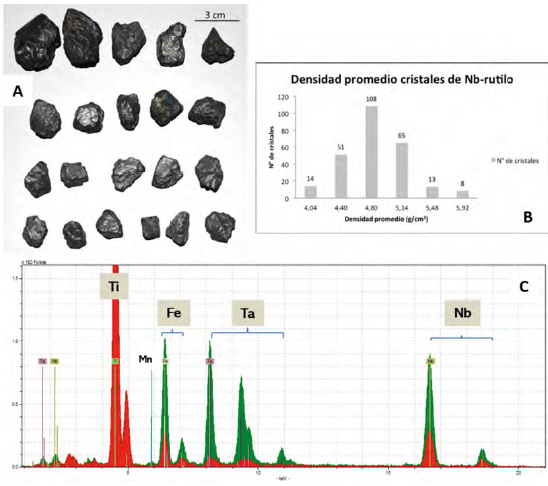 Se determinó una densidad promedio para 268 granos de rutilos-(Nb,Ta) de 4,83 g/cm3 a diferencia de la densidad teórica 4,25 g/cm3 para rutilos puros, evidencia de un enriquecimiento de Nb y Ta tanto en la estructura cristalina de este mineral (ilmenorutilo- estruverita) como en forma de inclusiones con un aumento paralelo de la densidad hasta 5,9 g/cm3.