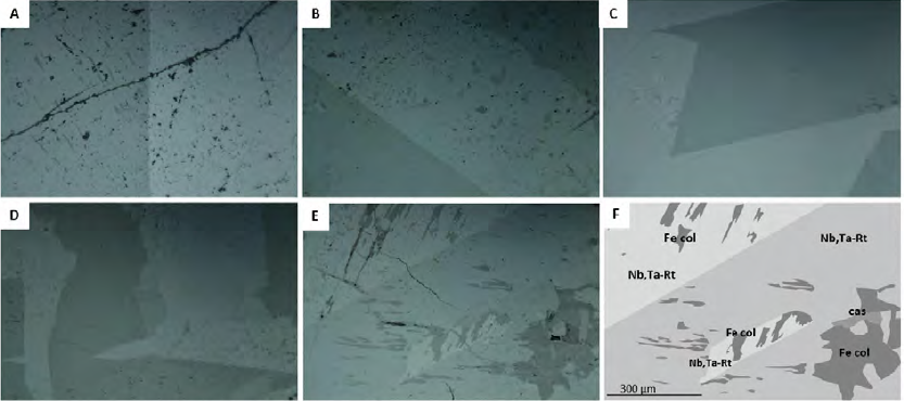 Metalografía. En las 6 secciones pulidas de rutilos-(Nb,Ta) se reconocieron las principales características en luz reflejada (Tabla 1). Los cristales en forma de agregados masivos se diferencian por una reflectancia relativamente alta, la anisotropía con nicoles cruzados es especialmente fuerte en los límites donde la extinción exhibe texturas ramificadas, de enrejado e interdigitada de contactos sinuosos y rectos similares a maclas simples y de “rodillas” con el plano de macla (101) típicas (Figura 6), probablemente debido a dislocaciones durante el crecimiento de los rutilos. Los reflejos internos muy marcados en aceite los distinguen de otros minerales como magnetitas.