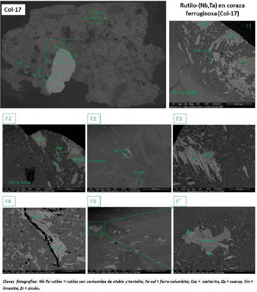 MEB -EDX. En las imágenes MEB de una muestra de coraza ferruginosa (Col-17-Cf, Figura 7) se observa la relación rutilo-(Nb,Ta) y la coraza ferruginosa. También en las magnificaciones no se ven bordes de reacción entre ambos. Mediante análisis EDX se reconocieron las fases minerales circón, ilmenita y cuarzo en una matriz de óxidos e hidróxidos de Fe como los principales componentes de la coraza ferruginosa. En el cristal de rutilo-(Nb,Ta) se observan inclusiones de hasta 250 mm de columbita de formas irregulares pero en gran parte orientadas a lo largo de planos cristalográficos que en la mayoría de los casos están asociadas con inclusiones más pequeñas de casiterita.