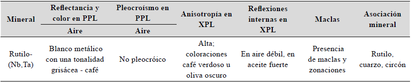 Metalografía e imágenes SEM revelaron inclusiones de tamaños entre 10 a 250 micrómetros, de columbita– tantalita y en menor media casiterita en una matriz de rutilo que contiene elementos como Fe, Nb, Ta, Mn, Sn y W indicando una relación genética con la cristalización de columbita-tantalita reportadas en territorio venezolano.