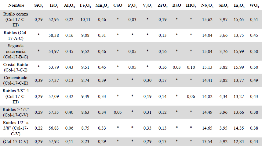 FRX en polvo. El análisis químico con FRX del mineral pulverizado (Tabla 2) refleja tanto la incorporación de otros cationes con radios iónicos similares en la estructura cristalina de los rutilos como también una variedad de inclusiones o exsoluciones que se mantiene en proporción general donde dominan además de Ti (rutilos), Nb y Ta (columbita– tantalita) seguidos por Sn (casiteritas) y se mantienen ± constantes Fe2O3 cerca de 10% y Mn3O4 y WO3 entre 0,3-0,5%. Los rutilos-(Nb,Ta) presentan una composición promedio en % en peso del 53% TiO., 14% Nb2O5 y 13% Ta2O5. Expresando por ejemplo en las mediciones de la muestra Rutilo coraza (Col- 17-C-III) de la Tabla 2 se puede calcular una formula aproximada de Ti0,64 Fe0,12 Mn0,01 Nb0,11 Ta0,07 Sn0,03 O2. La carga catiónica insuficiente calculada se aumenta todavía si se asume todo hierro como Fe2+ = FeO (el estado de oxidación más probable) en vez de Fe3+ (= Fe.O.) como expresado en la Tabla 2. Una parte de Fe y Mn forma parte de las inclusiones de columbita que concentran también la mayor parte de Ta y Nb. Pero la serie de los rutilos puede incorporar varios otros cationes hasta formar miembros finales diferentes en la estructura tetragonal de rutilo. No se han evidenciado magnetitas y solamente muy pocas ilmenitas en las muestras, ni signos de leucoxenización, así que el contenido alto de Fe se debe probablemente a una sustitución acoplada Ti4+ - Fe3+ - Fe2+- Nb5+-Ta5+ (ej. Fe3++Nb5+↔2Ti4+) en los rutilos y parcialmente en las columbitas-(Fe). La composición química de los rutilos puede variar considerablemente, influenciando propiedades como la densidad.