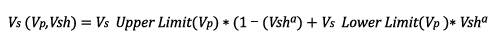 (1)Where Vs corresponds to the S-wave velocity, Vp corresponds to the P-wave velocity and Vsh corresponds to the shale volume. It is worth to mention that this equation is not in the literature and therefore it represents a new approach in this process of physical properties modeling. For equation 1, the blue expression represents the trend for rocks with low or none shale volume while the red expression represents the trend for rocks with high shale content. Figure 8 illustrates an example made with data from the correlation wells where both limits, upper and lower, were defined from the interpretation of the point’s distribution. To have an idea of how well equation 1 predicts S-wave velocity, Figure 9 shows the resulting model of the application of equation 1 and its corresponding error estimated by comparing the modeled with the original S-wave velocity.