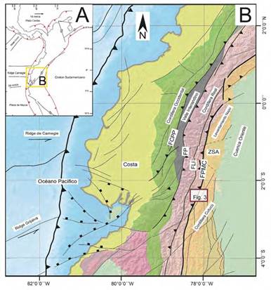 El principal accidente morfológico de la margen noroeste sudamericana es los Andes del Norte, que en Ecuador mantiene una tendencia norte-sur e incluye dos cordilleras genéticamente distintas: la Cordillera Occidental, que se compone de rocas volcánicas máficas e intermedias y rocas intrusivas yuxtapuestas, principalmente con depósitos turbidíticos de edad Cretácico tardío a Oligoceno (Vallejo et al., 2009, 2019; Jaillard et al., 2009); y la Cordillera Real, que representa un núcleo de rocas metamórficas paleozoicas y granitos mesozoicos exhumados (Litherland et al., 1994; Spikings et al., 2015). Estas cordilleras están separadas por el valle Interandino que guarda el registro del volcanismo cuaternario, limitado al oeste por la falla Calacalí-Pujilí-Pallatanga (FCPP en Figura 1) y al este por la falla Peltetec (FP en Figura 1) (Litherland et al., 1994). El sistema de fallas Palanda- Méndez-Cosanga (FPMC en Figura 1) representa el límite este de la Cordillera Real; al este de la FPMC se encuentra la Zona Sub-Andina (ZSA en Figura 1), la cual constituye el wedge-top andino, es decir, un cinturón deformado y exhumado, que registra el levantamiento de los Andes y su avance hacia el este en un sistema de cuenca de antepaís. Las rocas expuestas en la ZSA a su vez proporcionan información sobre las diversas secuencias sedimentarias de la Cuenca Oriente. La complejidad de la ZSA está relacionada con la propagación del frente orogénico sobre un sustrato heterogéneo heredado de paleogeografías preandinas (Ruiz et al., 2004; Baby et al., 2013).