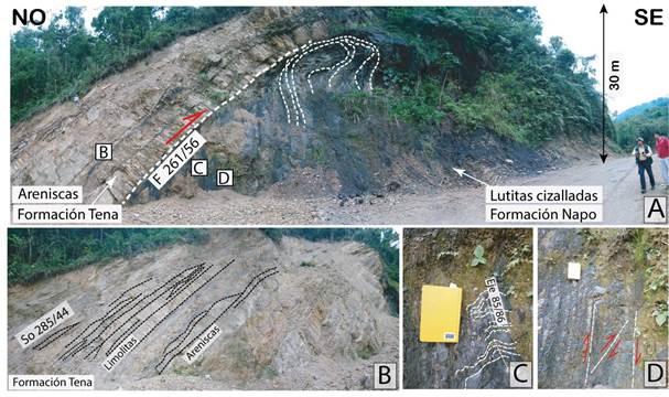 En la zona plegada, los pliegues de arrastre son evidencia de estructuras de cabalgamiento que presentan un rumbo andino con buzamientos fuertes a verticales (60º a 90º). Localmente, se observa una falla inversa 261/56 (falla J, FC2-27), que afecta a estratos de areniscas de la Formación Tena y estratos de lutitas de la Formación Napo y genera un pliegue de arrastre (Figura 9, Figura 10A). En los flancos del pliegue, los estratos de areniscas intercalados con finas capas de lodolitas y limolitas laminadas (S0: 285/44) definen la secuencia sedimentaria Cretácica-Paleógena (Figura 10B). En la Formación Napo, se evidencian rasgos estructurales en las lutitas negras como micropliegues (Eje: 85/86) y estructuras Riedel (Figuras 10C-10D), mostrando una cinemática inversa.