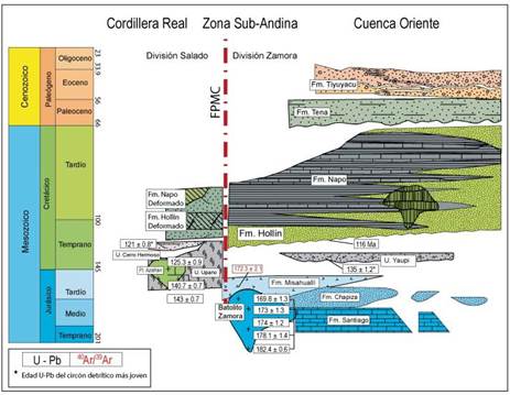 Hacia el sur de la ZSA, el basamento de la Cordillera Cutucú está compuesto por cuarcitas y filitas de la Formación Pumbuiza, así como por calizas fosilíferas, areniscas calcáreas y lutitas de la Formación Macuma (Tschopp, 1953). En discordancia con el basamento, se deposita la Formación Santiago, que se compone de calizas, lutitas fosilíferas, areniscas calcáreas y niveles volcánicos (Tschopp, 1953) con abundantes trazas de amonites del Jurásico inferior (Gaibor et al., 2008). La Formación Santiago está cubierta en discordancia por múltiples secuencias de red beds de la Formación Chapiza (Tschopp, 1953). Según Litherland et al. (1994) la Formación Misahuallí representa la expresión volcánica de intrusiones jurásicas y se compone de andesitas, riolitas y brechas volcánicas (Figura 2).