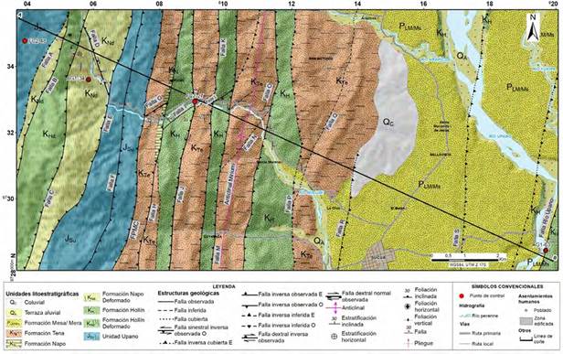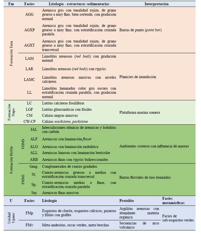 La Formación Napo se compone de lutitas negras calcáreas fosilíferas intercaladas entre paquetes de calizas wackstone y packstone y esporádicos niveles de areniscas glauconíticas. Facies deformadas incluyen meta-lutitas, filitas, pizarras con cementación calcárea y calizas masivas recristalizadas en donde se documentaron amonites Inoceramus sp. y Harleites sp. (?). La Formación Napo está cubierta en discordancia angular por la Formación Tena, que incluye areniscas con gradación normal, estratificación cruzada transversal y paralela, intercaladas con areniscas limosas multicolores con laminación paralela, laminación cruzada y ripples de corrientes y limolitas arenosas con materia orgánica.