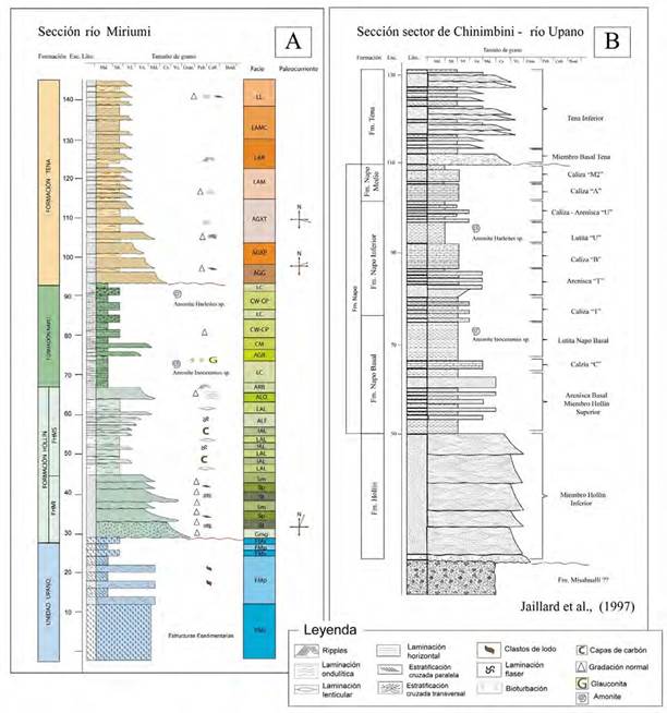 La Formación Napo agrupa intercalaciones de lutitas calcáreas, calizas y areniscas glauconíticas, con abundante fauna de plataforma marina del Cretácico superior (Jaillard et al., 1997). Es importante considerar que bloques deformados de la Formación Napo (probablemente por la dinámica de las fallas regionales) han sido observados en continuidad a secuencias no deformadas. Al sureste del área de estudio, en las márgenes del río Upano y en el sector de Chinimbini, Jaillard et al. (1997) describen a detalle la Formación Napo (Figura 4B), en donde reportan la presencia de bivalvo Inoceramus sp. y amonite Harleites sp. (?); estas especies han sido identificadas en estratos deformados de la Formación Napo en el río Miriumi.