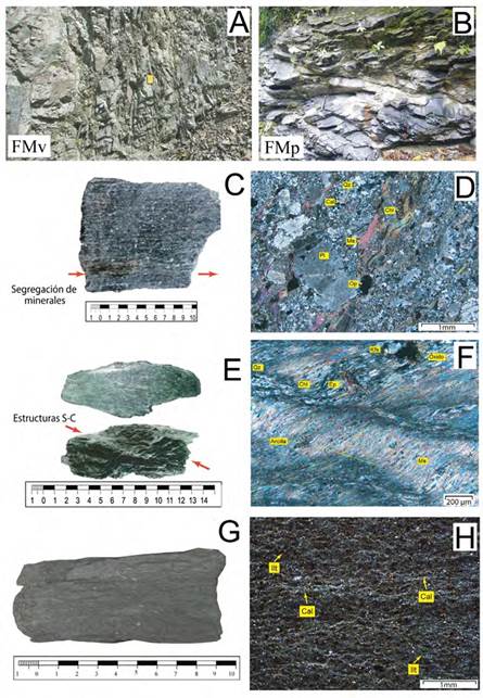 4.1.1 Unidad Upano (JSU): al oeste de la FPMC aflora la Unidad Upano en forma de escamas y franjas tectónicas limitadas por fallas de rumbo norte- noreste, de alto ángulo (Figura 3), compuestas por facies meta-volcánicas (FMv) y facies meta-pelíticas (FMp). La parte inferior de la secuencia se compone de apilaciones verticales de estratos diaclasados de 20 m a 30 m (Figura 4; Figura 5A), compuestos por meta- andesitas porfiríticas, con plagioclasa (38%), epidota (28%), clorita (18%), hornblenda (16%) ± sericita (<10%) de grano fino a medio (Figura 5C-5D) y rocas verdes masivas con clorita (30%), epidota (25%), plagioclasa (15%) ± sericita (<10%) ± cuarzo (<5%) (FMv en Tabla 1; Figura 4). En menor proporción, se observan meta-brechas silicificadas, con fragmentos deformados de andesitas, rocas verdes y filitas; en la matriz se tienen altas proporciones de clorita (35%) y sericita (30%), con diseminación de sulfuros (<10%). También se observan fragmentos deformados y estructuras de reemplazamiento, calcita ± epidota que reemplaza a la hornblenda.