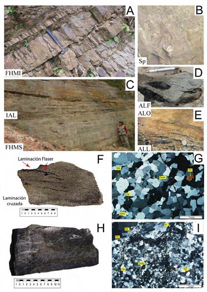 En las cercanías del poblado García Moreno, el miembro superior de la Formación Hollín (FHMS) se deposita localmente en onlap sobre el miembro inferior de la Formación Hollín, e incluye secuencias de estratos de geometría tabular, lateralmente continuos, compuestos por intercalaciones rítmicas de areniscas (IAL en Tabla 1, Figura 4; Figura 6C) de grano fino a muy fino, con laminación flaser (ALF en Tabla 1, Figura 4, Figuras 6D-6F-6G), ondulítica (ALO en Tabla 1, Figura 4; Figuras 6E), ripples bidireccionales (ARB en Tabla 1, Figura 4), superficies de reactivación, areniscas limosas con laminación lenticular (ALL en Tabla 1, Figura 4) y carbón (Figura 4). También se observan estratos de lodolitas masivas con restos de raíces y carbón, con buena continuidad lateral y geometría mantiforme de 50 cm a 2 m (Figuras 6D). La mineralogía de estas facies está dominada por cuarzo (65%); en menor proporción se observan illita (15%), carbón (10%) y moscovita (10%). En las proximidades al río Upano, el miembro superior presenta espesores cercanos a los 40 m, mientras que en las cabeceras del río Miriumi, su espesor no supera los 20 m (Figura 4).