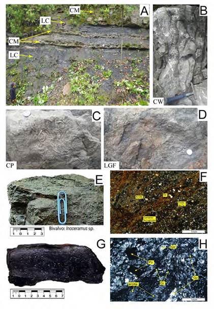 Formación Napo (KN): aflora en las inmediaciones del poblado Miriumi, en forma de franjas aisladas de dirección noreste-suroeste, estratigráficamente limitada por la presencia de la Formación Tena hacia las partes altas (Figura 3). Agrupa secuencias estratificadas de lutitas negras con cementación calcárea (LC en Tabla 1, Figura 4, Figura 7A), niveles de calizas negras masivas (CM en Tabla 1, Figura 4; Figura 7A), calizas de textura wackstone y packstone (CW-CP en Tabla 1, Figura 4; Figura 7B-7C) y lutitas glauconíticas bioturbadas con improntas de amonites (LGF en Tabla 1, Figura 4; Figura 7D). Al oeste de Miriumi se documentaron lutitas laminadas con abundantes bivalvos y gasterópodos, incluyendo el bivalvo Inoceramus sp. y el amonite Harleites sp. (?). El espesor de la Formación Napo en el río Miriumi no supera los 30 m, mientras que en la margen oeste del río Upano el espesor de la Formación Napo alcanza 60 m (Figura 4).