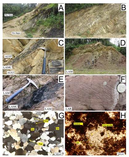 La parte media y superior de la secuencia se caracteriza por la presencia de estratos métricos de 1 m a 3 m, tabulares y mantiformes, lateralmente continuos de limolitas arenosas masivas de color rojo a violeta (LAM en Tabla 1, Figura 4 y Figura 8D), con laminación paralela (LL en Tabla 1, Figura 4 y Figura 8D), abundantes niveles masivos con materia orgánica (LAMC en Tabla 1, Figura 4 y Figura 8E) y ripples de corriente (LAR en Tabla 1, Figura 4 y Figura 8F). También se observan en esta parte de la secuencia estratos canalizados de areniscas de grano medio a fino, con estratificación cruzada (AGXT en Tabla 1, Figura 4), gradación normal (AGG en Tabla 1, Figura 4) y fragmentos de limolitas rojas. Secciones delgadas de areniscas de la Formación Tena muestran textura psamítica de grano medio a grueso, composición oligomíctica, con cristales subangulares a subredondeados de cuarzo (60%) y plagioclasa (10%), con proporciones relativas de minerales opacos (Figura 8G). Las limolitas arenosas con cemento ferruginoso muestran cristales de cuarzo, plagioclasa y abundantes óxidos de hierro (Figura 8H). El espesor de la Formación Tena observado en las proximidades a Miriumi corresponde a 65 m, y en las márgenes del río Upano su espesor disminuye a menos de 20 m (Figura 4).