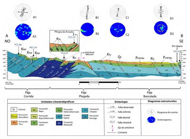 La zona de estudio fue interpretada en el corte geológico-estructural “A-B” de dirección noroeste a sureste, comprendida desde el sector de los Altos del río Miriumi, en las estribaciones orientales de la Cordillera Real, hasta el margen este del río Upano en Sucúa, correspondiente a la ZSA (Figura 3). Las principales estructuras comprenden un sistema de fallas de rumbo andino casi norte-sur que forma fajas longitudinales paralelas. El perfil geológico estructural “A-B” se caracteriza por el desarrollo de tres estilos de deformación, descritos a continuación.