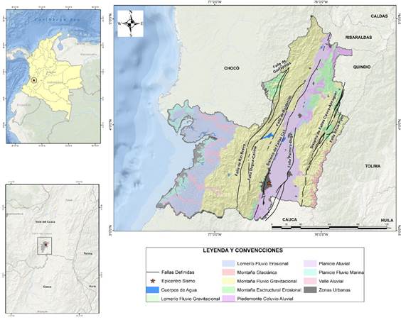 El primer reporte sobre este evento lo marca instrumentalmente Gutenberg y Richter (1954), quienes registran su ocurrencia a las 23:41 UTC, en el océano Pacífico en las coordenadas 3,0ºN de latitud y 78,0ºO de longitud, a 170 km de profundidad.Engdahl y Villaseñor (2002) establecen que el sismo tuvo su epicentro cerca del municipio de Tuluá en el departamento del Valle del Cauca, con coordenadas 4,02ºN de latitud y 76,07ºO de longitud, profundidad superficial, establecida convencionalmente en 33 km. El proyecto Global Earthquake Model (ISG-GEM, 2015) asigna las coordenadas del epicentro en 4,279°N y 75,331°O, y magnitud Mw 6,3. La incertidumbre en la determinación de las coordenadas epicentrales y la profundidad no ha permitido su asignación a una fuente sismogénica concreta. En la Figura 1 se presenta, sobre el mapa geológico del departamento del Valle del Cauca el epicentro macrosísmico del terremoto del 07 de junio de 1925; también se muestran las principales fallas activas de la región, como Río Bravo, Dagua-Calima, Roldanillo, Palmira-Buga, Silvia-Pijao y los sistemas de falla Cali-Patía y Cauca- Almaguer, que en general mantienen una dirección SSO-NNE (París y Romero, 1994; París et al., 2000; Nivia, 2001; INGEOMINAS, 2005b). Algunas de estas fallas han sido responsables de importantes eventos sísmicos históricos que han causado daños o efectos considerables en varias poblaciones del suroccidente colombiano. En el presente estudio el epicentro macrosísmico, preliminarmente, se ubica cerca de la ciudad de Cali, y podría estar asociado al sistema de fallas Cali-Patía, en una zona de planicie aluvial, lo cual deberá corroborarse al establecer su profundidad.