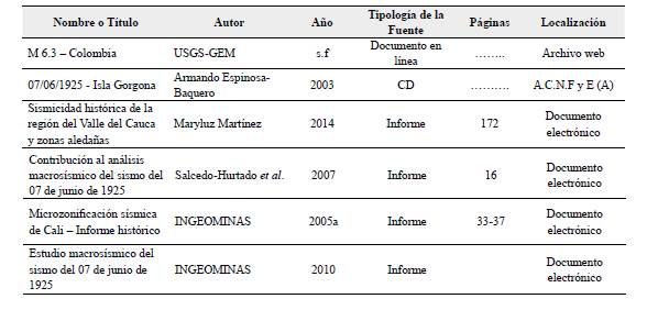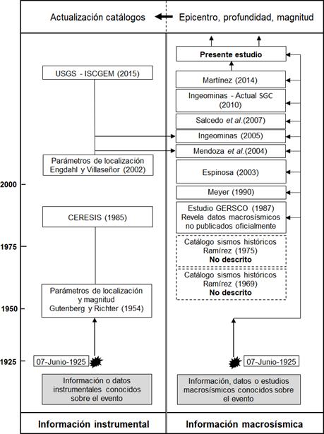 En la Figura 2 se muestra la secuencia temporal y la naturaleza de los estudios anteriormente realizados sobre el terremoto del 07 de junio de 1925, ocurrido en el suroccidente colombiano. Por su parte, la Tabla 1 presenta las intensidades asignadas por cada uno de los estudios anteriores, acorde con la información recopilada. Como se aprecia, por causa de este terremoto resultaron afectados diversos municipios de varios departamentos de las regiones del Pacífico, Eje Cafetero, centro y norte de Colombia; sin embargo, los mayores efectos se presentaron en la ciudad de Cali y en otras poblaciones del departamento del Valle del Cauca.