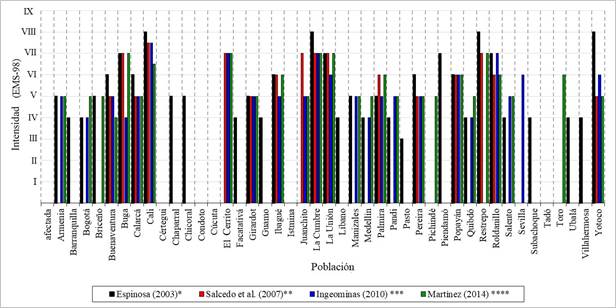 La Figura 3 presenta, de manera gráfica, la comparación de la asignación de las intensidades macrosísmicas dada por los estudios anteriores en diversas poblaciones del territorio colombiano, conforme se discrimina en la Tabla 1.