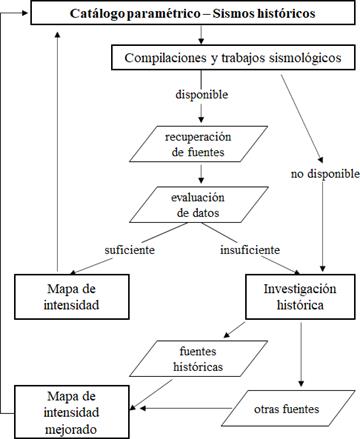 Sabiendo que existen diversos trabajos que presentan hipótesis de intensidades para del 07 de junio de 1925, y según Guidoboni y Stucchi (1993), se elige realizar una nueva investigación analizando y explotando los datos que están disponibles en las compilaciones sismológicas anteriores, mediante la ruta esquematizada en la Figura 4.
